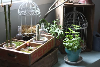 Now that summer has arrived get out your green thumb and show the Earth you care. Displaying plants and flowers in your home is a great way to liven up any space. This year I wanted to create something unique so I put together a garden sanctuary by the brightest window in my home. Instead of using traditional materials I chose vintage crates, birdcages and old jars. I included some branches and other accessories that matched my theme.