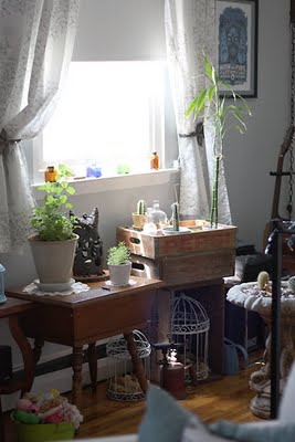 {Tip: When you want to create an area that shows off a collection or a number of plants like this, group items and furniture that resemble each other. Whether in color, texture or material, doing this will give a well thought out cohesive look instead of stuff you just piled together}