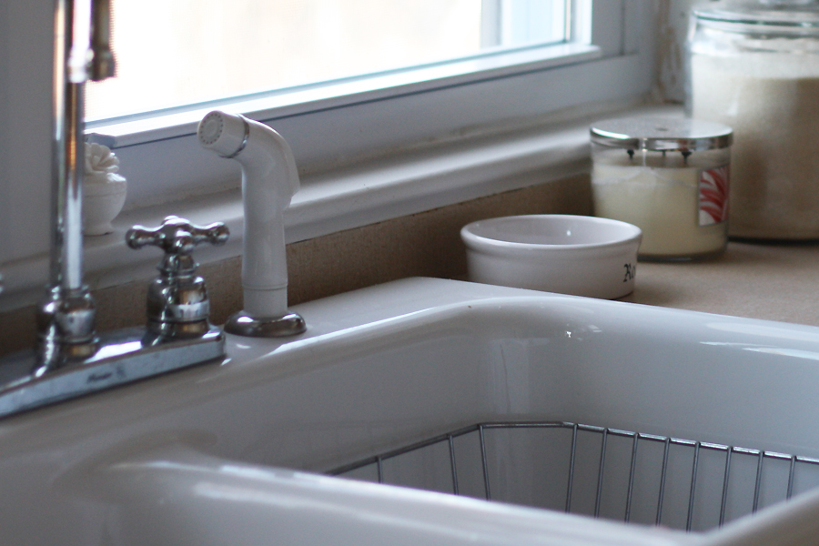 A new sink was in order so once that was installed along with our new faucet, the counter area looked much more cleaner and brighter. Because we plan on ripping everything out down the line, we decided to keep the countertop for now. Especially since it goes with our vintage theme.