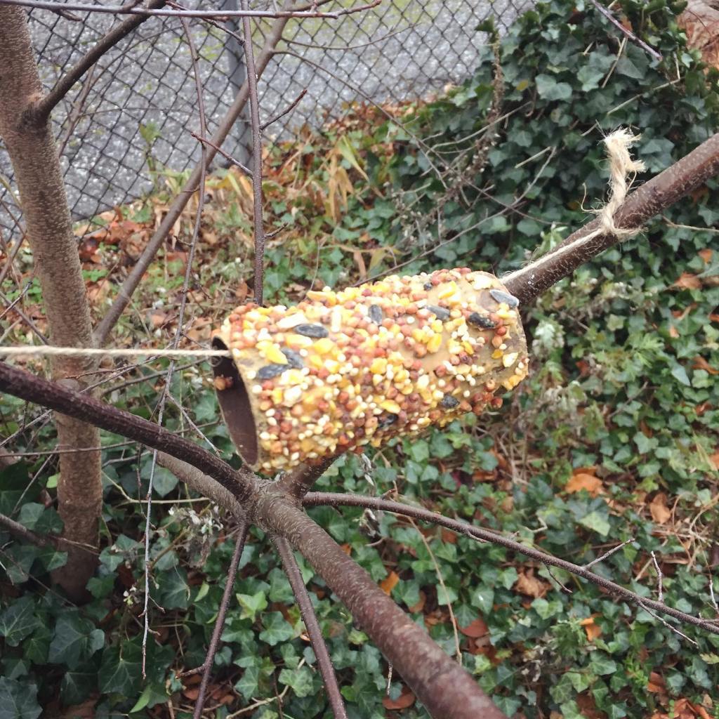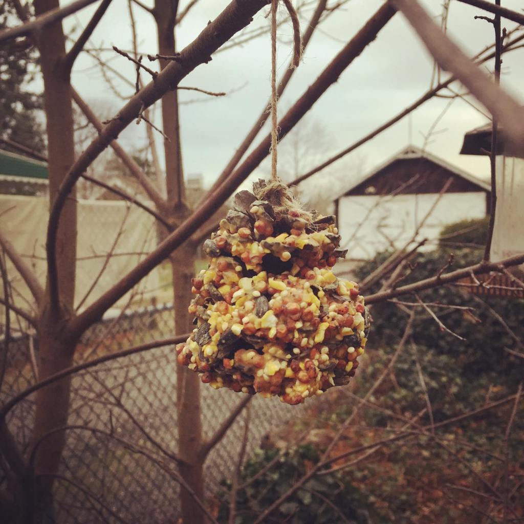 It’s winter birds week! Last night we made a bunch of homemade bird feeders for our little friends and this morning I hung them up around our property and left a few on the ground for the doves and squirrels. I also left one in a little sanctuary I created in one of our bushes the birds love to hang out in. We made a few from pine cones, two using toilet paper rolls and then some tiny cupcakes, all with peanut butter and bird seed. Looking forward to more projects today with my boy.