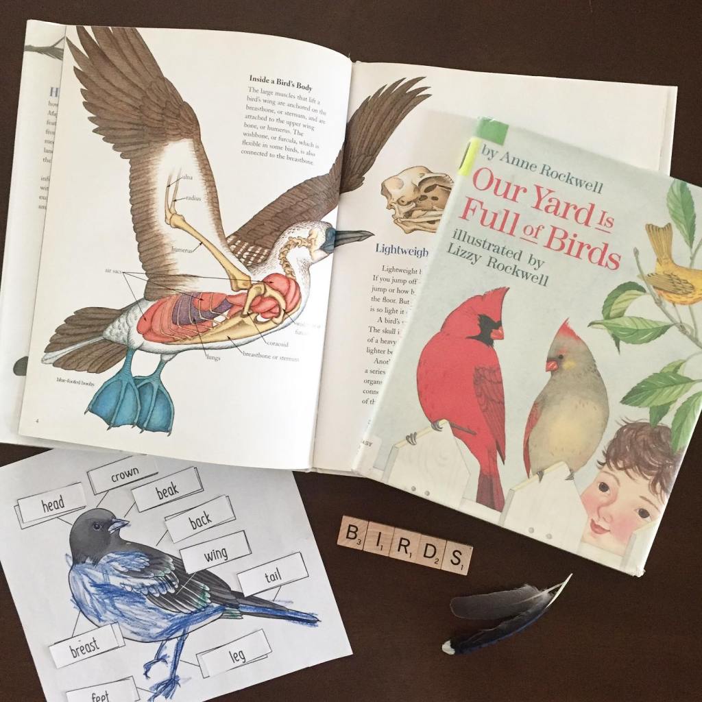 Moving on with our bird study we started our lesson by reading Our Yard is Full of Birds by Anne Rockwell and then learned a little about a birds anatomy with Birds: Nature’s Magnificent Flying Machines by Caroline Arnold. Our project was to paste the name of each body part of the bird using a worksheet I got from Teachers Pay Teachers. Elliot wanted to also color it so he made it blue for his favorite bird, the blue jay. Then we practiced letters a bit.
