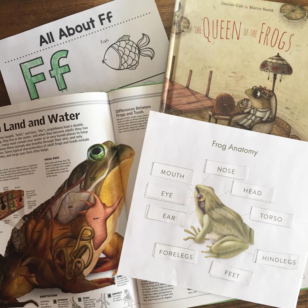 This afternoon we read The Queen of Frogs by Davide Cali and then we focused more on the anatomy of a frog for our lesson. I designed a worksheet for Elliot to complete and he also practiced the letter F a bit more. We also looked at a nice section on frogs in our book, Animals: Discover the Amazing Diversity of Nature by Discovery Kids. That’s a wrap!