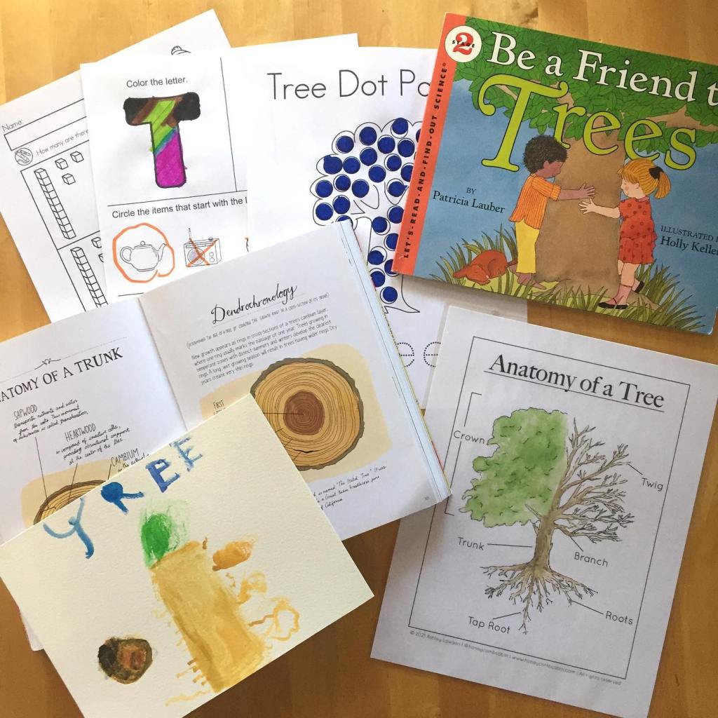 This week we are studying trees during spring. I always enjoy this subject and since we have learned so much about trees already it’s been awesome seeing how much Elliot remembers. We started our lesson with a good book, practiced the letter T and numbers, a fun dot painting, and went over the anatomy of a tree. We also learned about dendrochronology, observed a tree in our backyard, and had an art sesh. Then after lunch for our mini lesson we read a beautiful story about a girl and her favorite tree, learned a little about fruit trees, and observed a twig from our cherry tree.