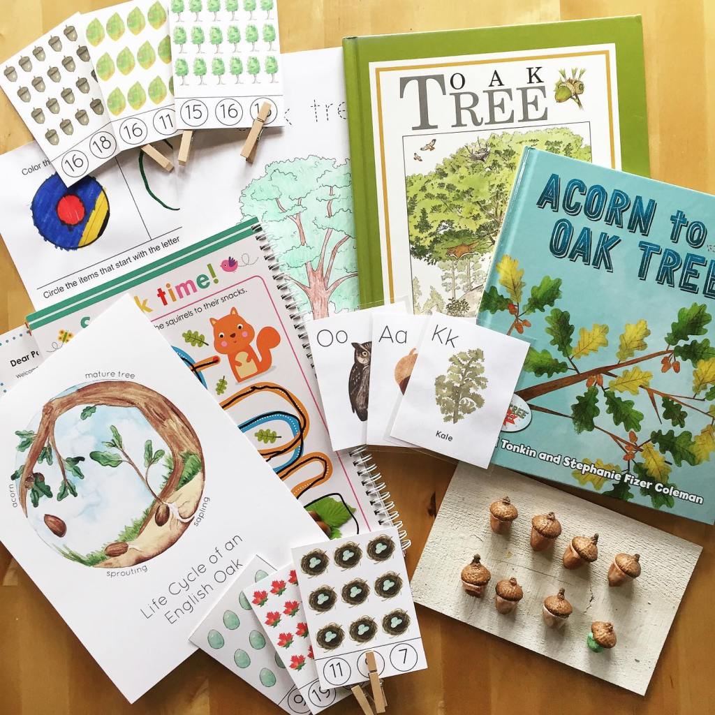 Today we are learning all about oak trees! We started by reading about the life cycle and looked through a beautiful book showing the seasonal changes. Then we practiced the letter O and numbers with our count & clip cards, completed a color sheet and a few circle & find worksheets, and also did some line work. For our art sesh we made little acorns out of clay and caps we found last week on our nature hike.