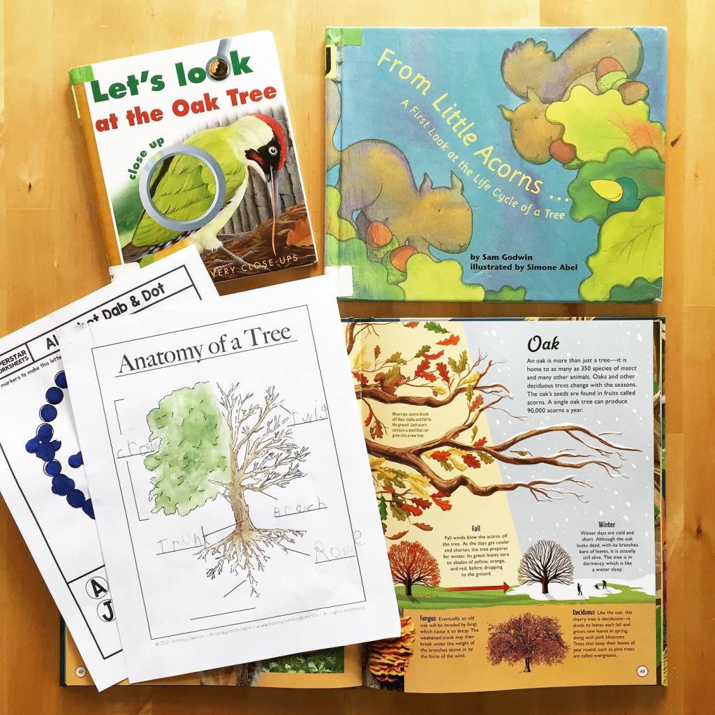 For our afternoon lesson we read some more about oak trees and also looked at a cool book that showed creatures up close. Then Elliot completed a fun dab & dot worksheet for the letter O and we reviewed the anatomy of a tree. That’s a wrap for our spring tree study!