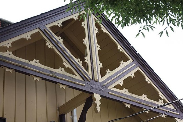 The front porch is held up with posts that feature scrolled corner braces. This design element is continued throughout the entire home. You will notice it significantly on the street side in the carved rafter ends of the home. This Swiss-inspired detailing creates a doll house look and adds an artistic feel to the overall design.
