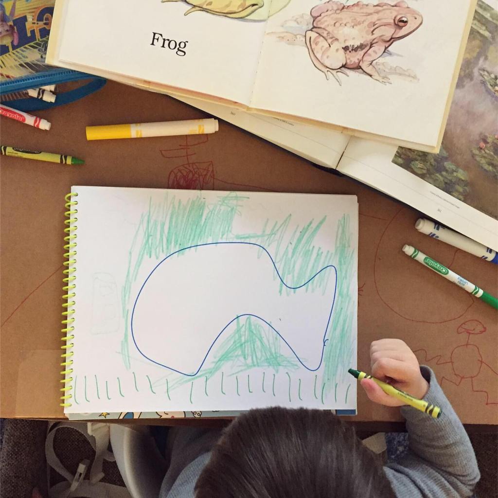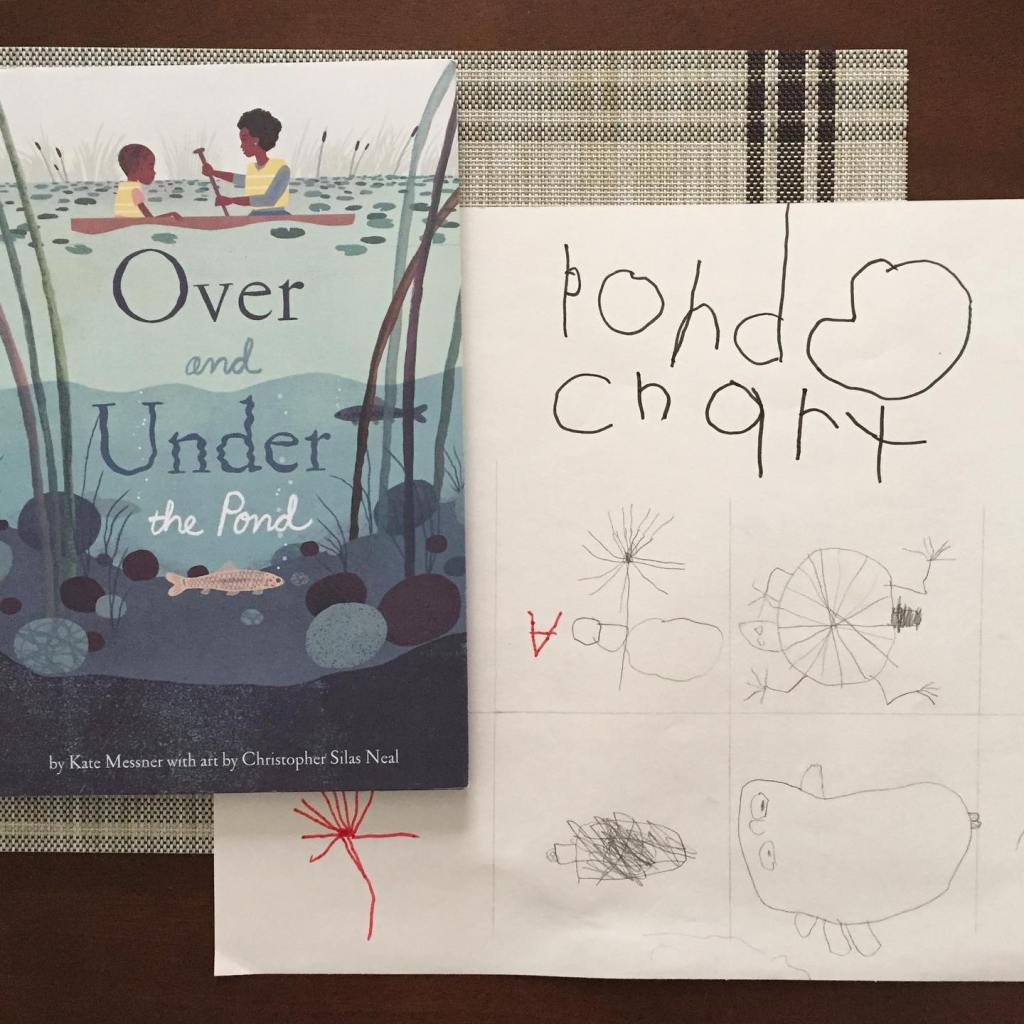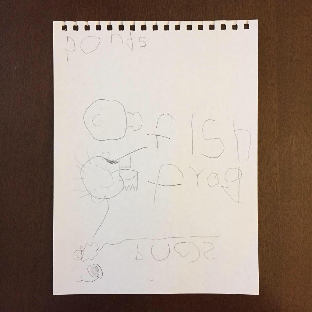 After, we got ready to draw our pond and first made a little list of some things we would find (from our discussion) and Elliot drew and wrote all of them down. Then he created his pond drawing with markers and crayons. He used Crinkleroot’s 25 More Animals Every Child Should Know as a reference guide.