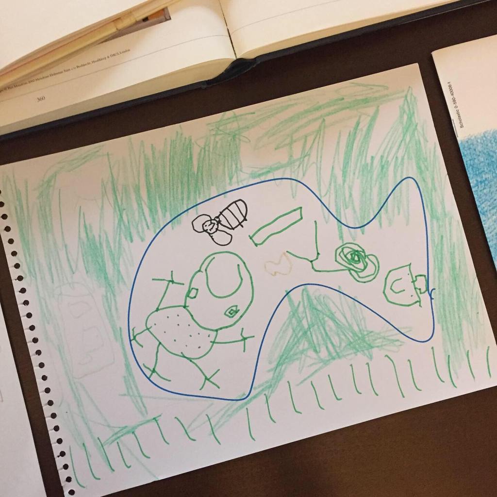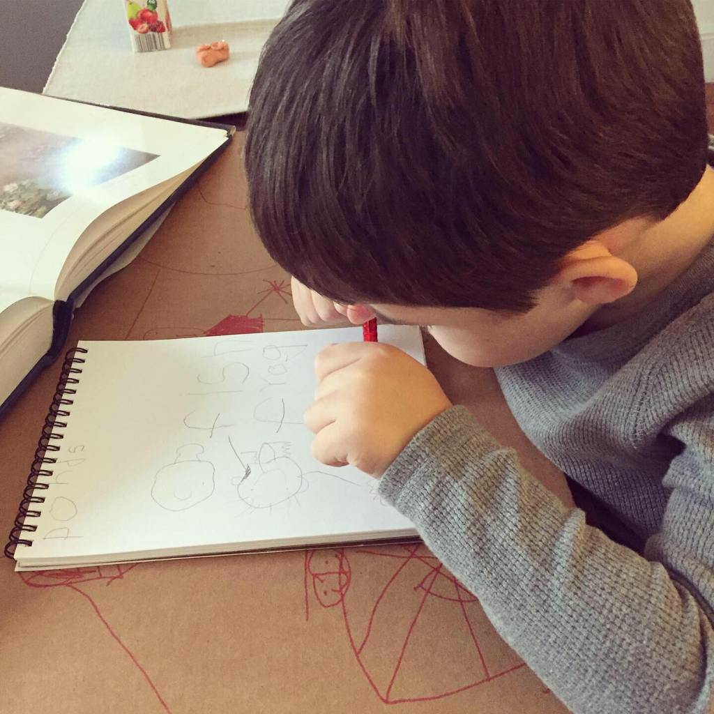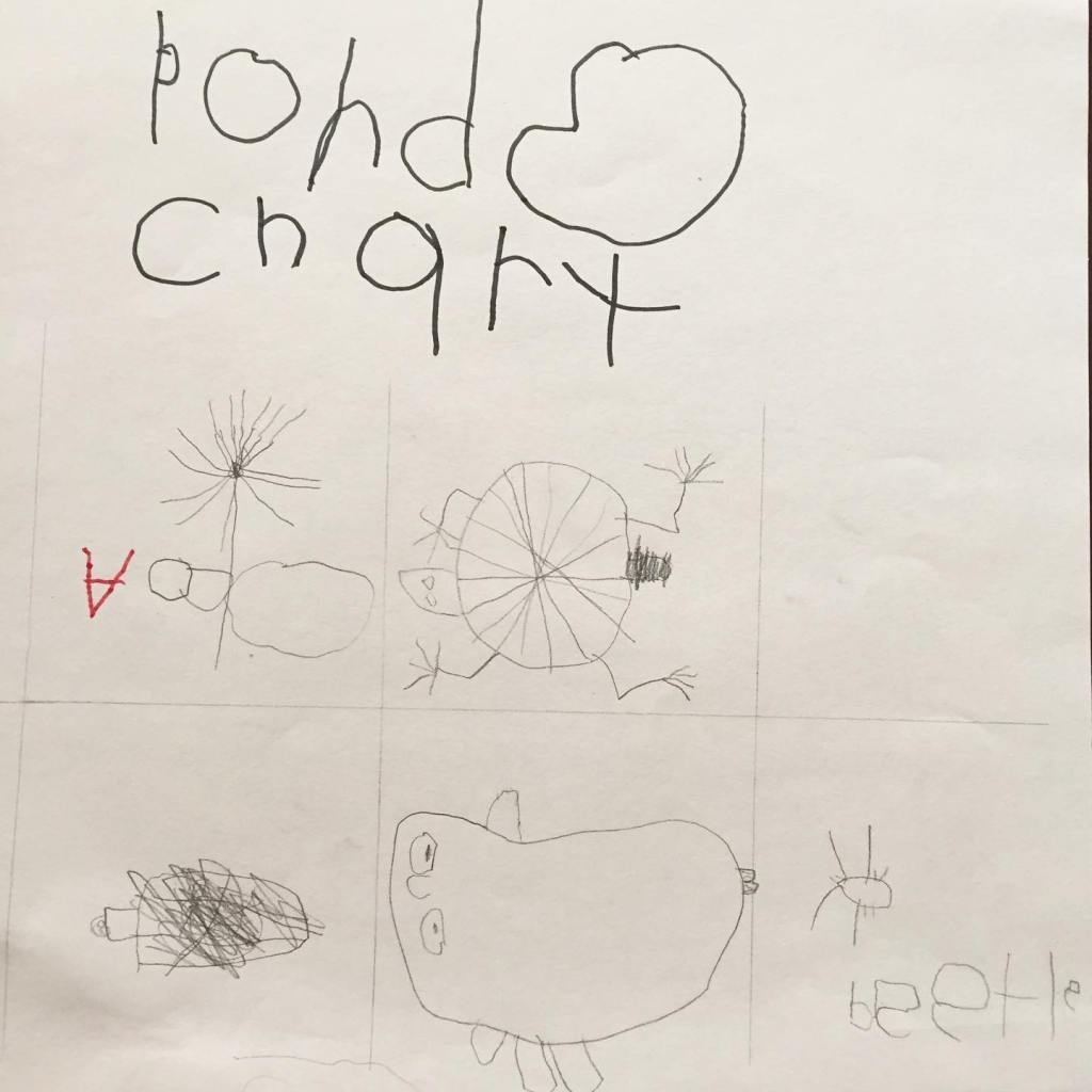 After, we got ready to draw our pond and first made a little list of some things we would find (from our discussion) and Elliot drew and wrote all of them down. Then he created his pond drawing with markers and crayons. He used Crinkleroot’s 25 More Animals Every Child Should Know as a reference guide.