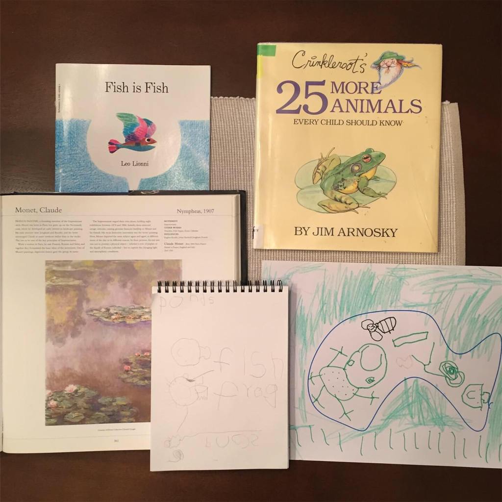 To sum up our lesson, we relaxed on the couch for quiet time and summarized with Crinkleroot’s Animals again and read Fish is Fish by Leo Lionni, a favorite from our collection.