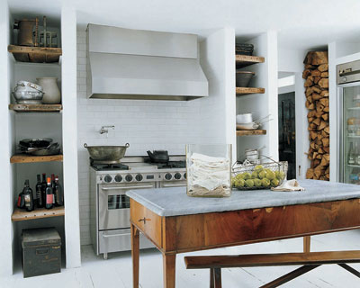 {The use of open shelving and high end appliances as well as the spacious feel presents a contemporary look. The addition of rustic accents helps it feel warmer}