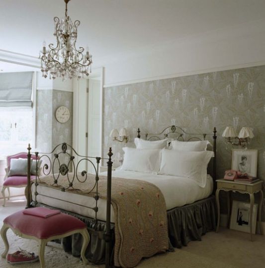 {A more modern version of the style, this traditional bedroom is fit for a queen. From the romantic chandelier to the victorian inspired wallpaper, this space is comfortable, elegant and classic}