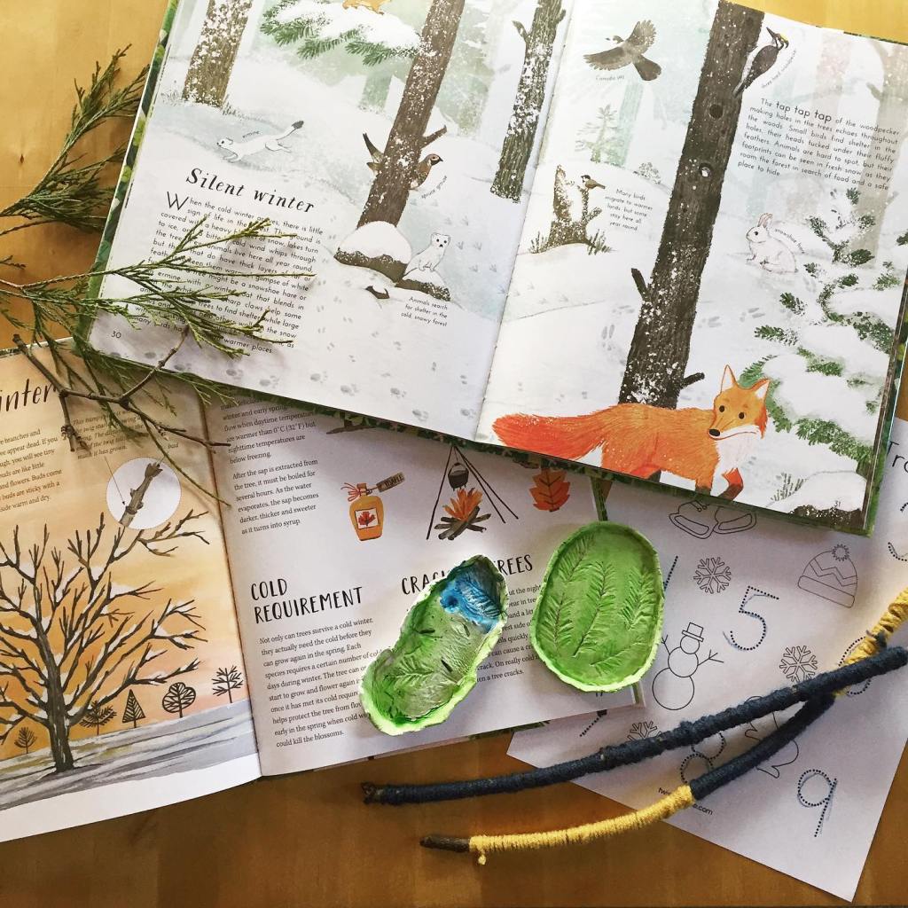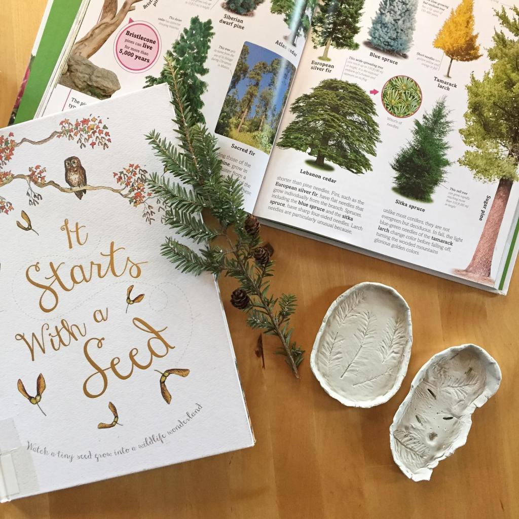 Today we learned about coniferous forests and all about the trees, animals and plants that call them home by reading Into the Forest by Christiane Dorian. This book is beautiful! Definitely going to add it to our collection. Elliot also practiced number tracing and the letter T. Before our projects we studied the parts of a branch (buds and rings) with Nature All Around: Trees by Pamela Hickman. Then we made magic wands from branches and yarn. He chose all blue and I chose blue and yellow. And finally painted our clay trays we made Tuesday. Trees are pretty awesome.