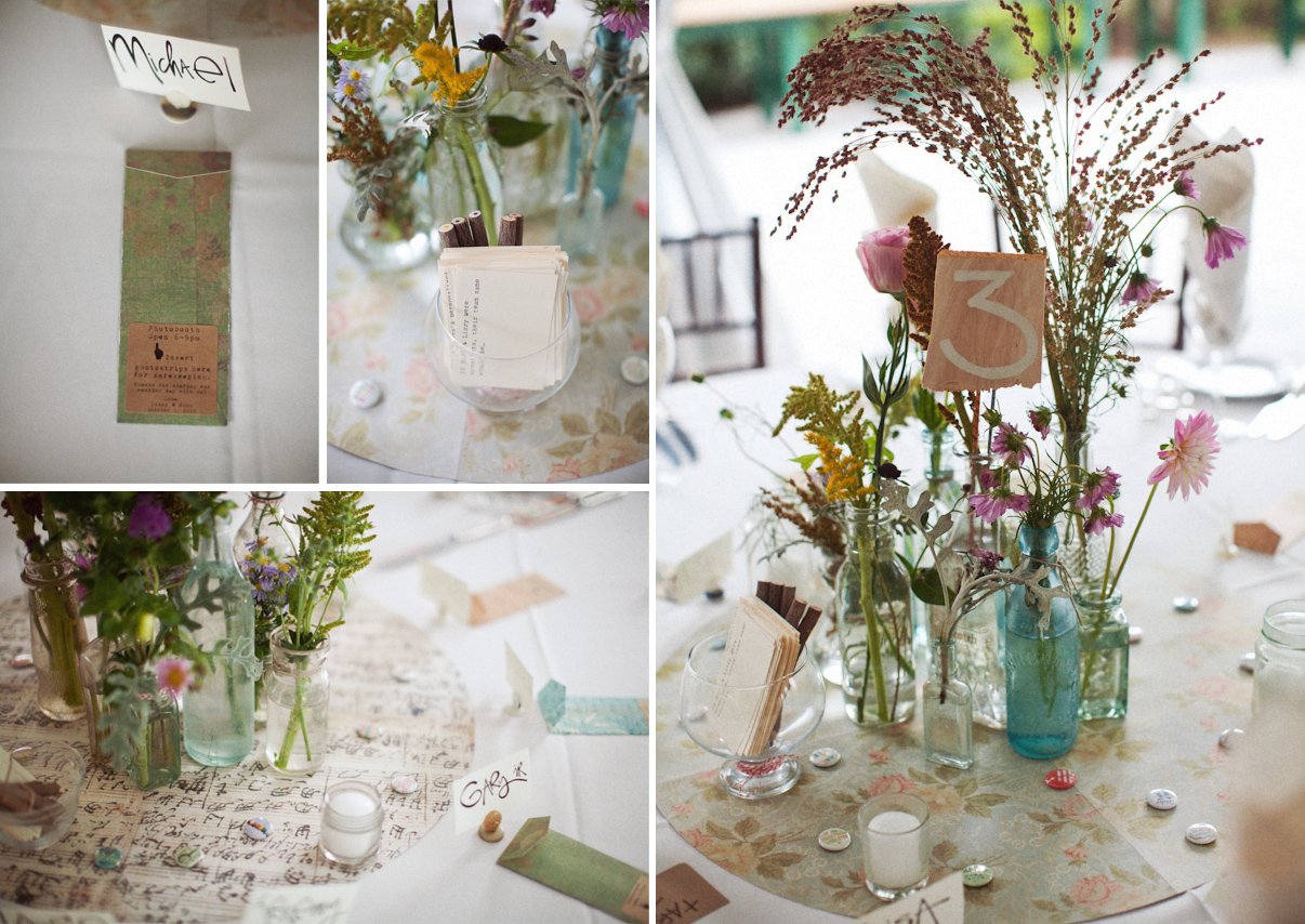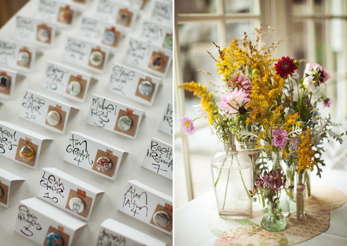 The reception decor was done by the bride and groom as well. All the escort cards were handwritten by Liz and adorned by a personalized button for each of the guests. The tables had collections of vintage bottles filled with an array of wildflowers. These one of a kind bottles were excavated by the bride in a Phoenixville landfill and spiffied up by the groom.
