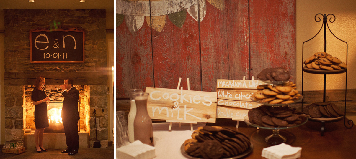 The couple served milk and cookies for dessert and had a red velvet cake made for them by Sweet Elizabeth’s. The reception was warm and cozy as the fireplaces blazed brightly. The sign that hung on the stone wall was put together by the bride and groom by repurposing an old frame they found and painting the inside with chalkboard paint.
