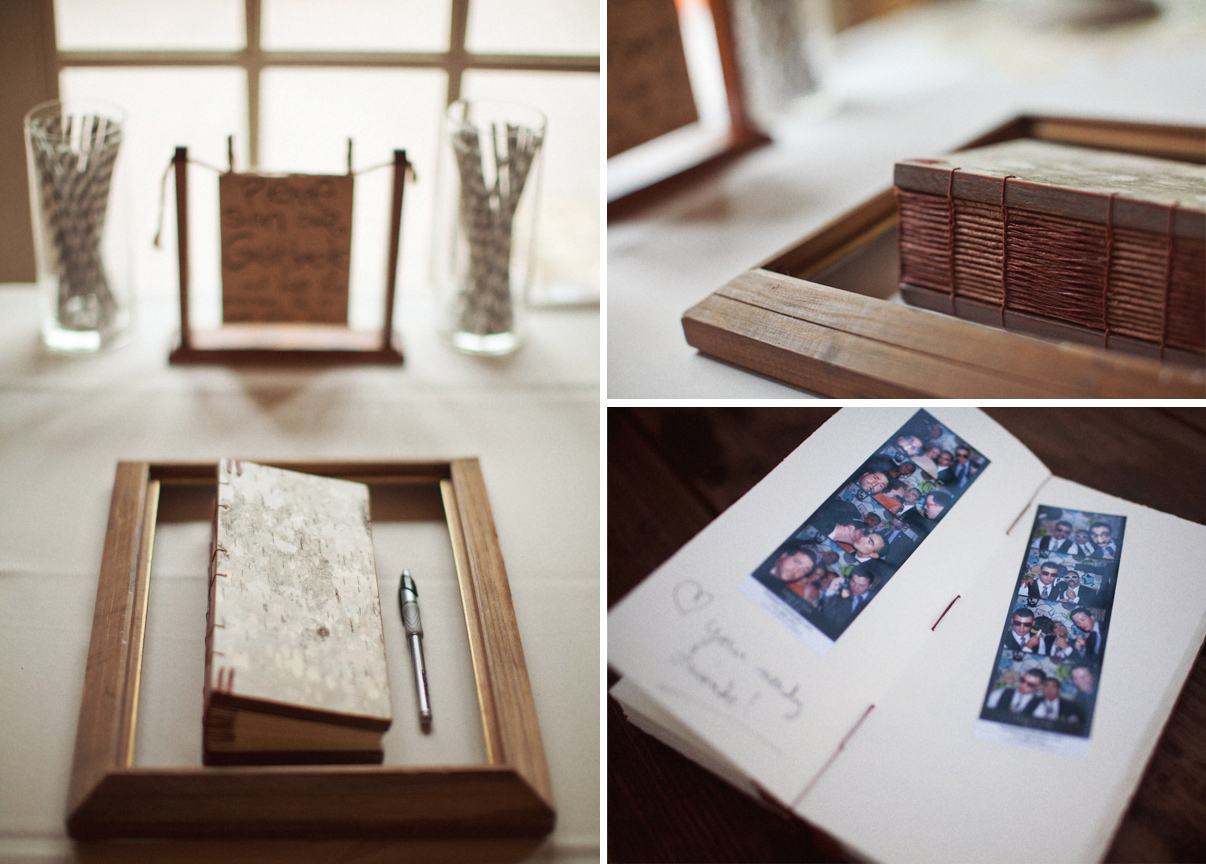 Antique patterned paper was used at the base of the centerpieces, tiny button placeholders rested at each setting and the table numbers were made out of pieces of wood shingles. To bring a little fun to the tables, the couple had included open ended sentence cards for the guests to answer which are now resting in their guestbook along with the photos taken at the photobooth.