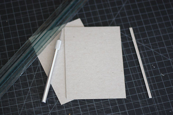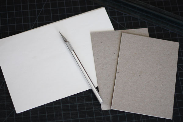 First, gather the cardboard. The two pieces of the same size will be the front and back cover and the small 1/4 inch piece will be the binding.
