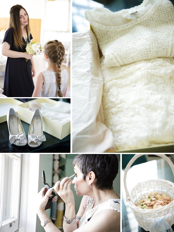 As our guests waited outside in our ceremony space, which was adorned with burlap and vintage fabric I had purchased on Etsy, the girls and I got dressed inside the barn. My mother wore a garden inspired dress from Anthropologie while Meg looked beautiful in a navy dress from JCrew. My flower girl and Meg’s daughter, Leona Faye, was absolutely adorable in her plaid dress and sandals, showing off a french braid done by my mother. I wore a Hitherto ivory sweater and ivory lace skirt along with Lulu Townsend heels. Azaara earrings graced my ears showing a little shine, a crystal bow and my love for pearls.