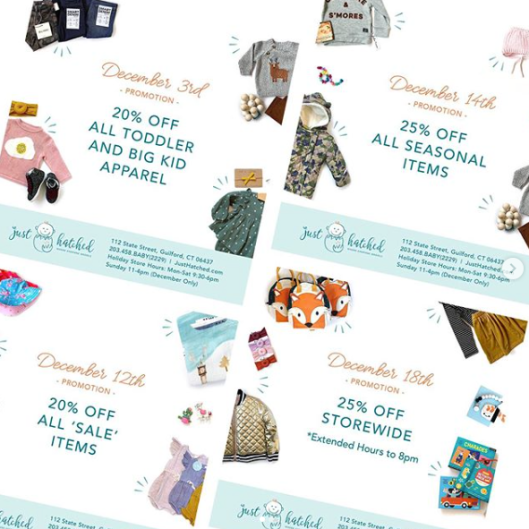 Some cute graphics I created for the CT shop @justhatchedbaby to promote their seasonal sales this year. It was great working with Karen and I just love the adorable items the store sells. I designed the marketing campaign with their branding in mind keeping it modern, sophisticated, and fun. If you’re in the Guilford area definitely stop in and take a look around. You won’t regret it. You can learn more about them and shop online at https://justhatched.com.